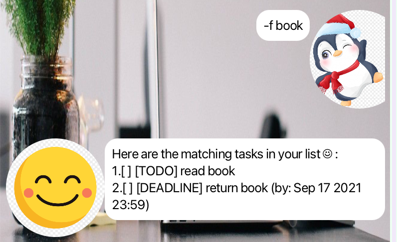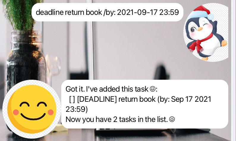 Example: deadline return book /by: 2021-09-17 23:59 adds a Deadline task to the task list.