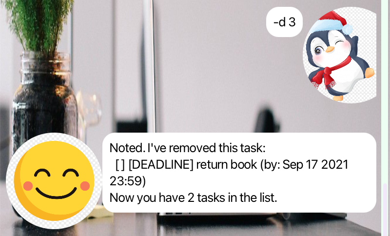-d <task number>Deletes a task, using the task number specified in the task list.