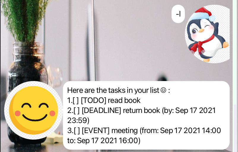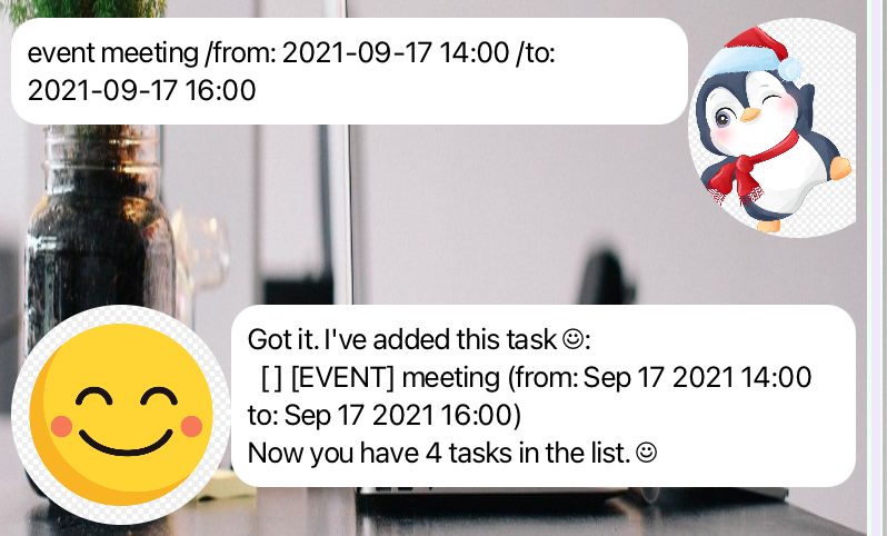 Example: event meeting /from: 2021-09-17 14:00 /to: 2021-09-17 16:00 adds an Event task to the task list.