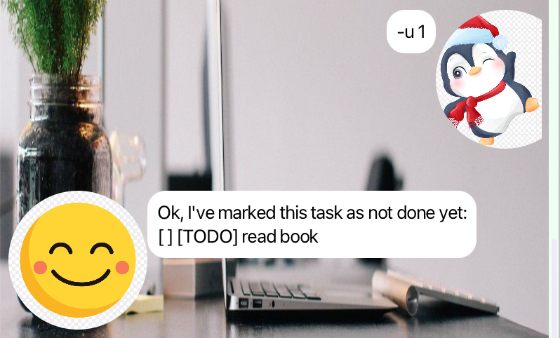 -u <task number>Marks a task as undone, using the task number specified in the task list.